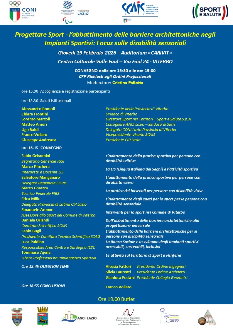 - Viterbo, 19/02/2026 – Convegno “PROGETTARE SPORT: L’inclusione attraverso l’abbattimento delle barriere architettoniche negli impianti sportivi: focus sulle disabilità sensoriali”