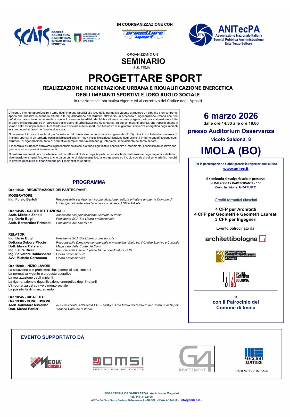 - 06/03/2026, Imola – PROGETTARE SPORT – REALIZZAZIONE, RIGENERAZIONE URBANA E RIQUALIFICAZIONE ENERGETICA DEGLI IMPIANTI SPORTIVI E LORO RUOLO SOCIALE