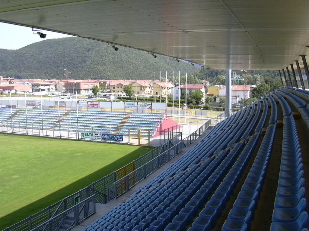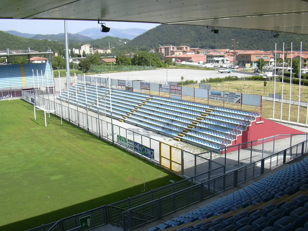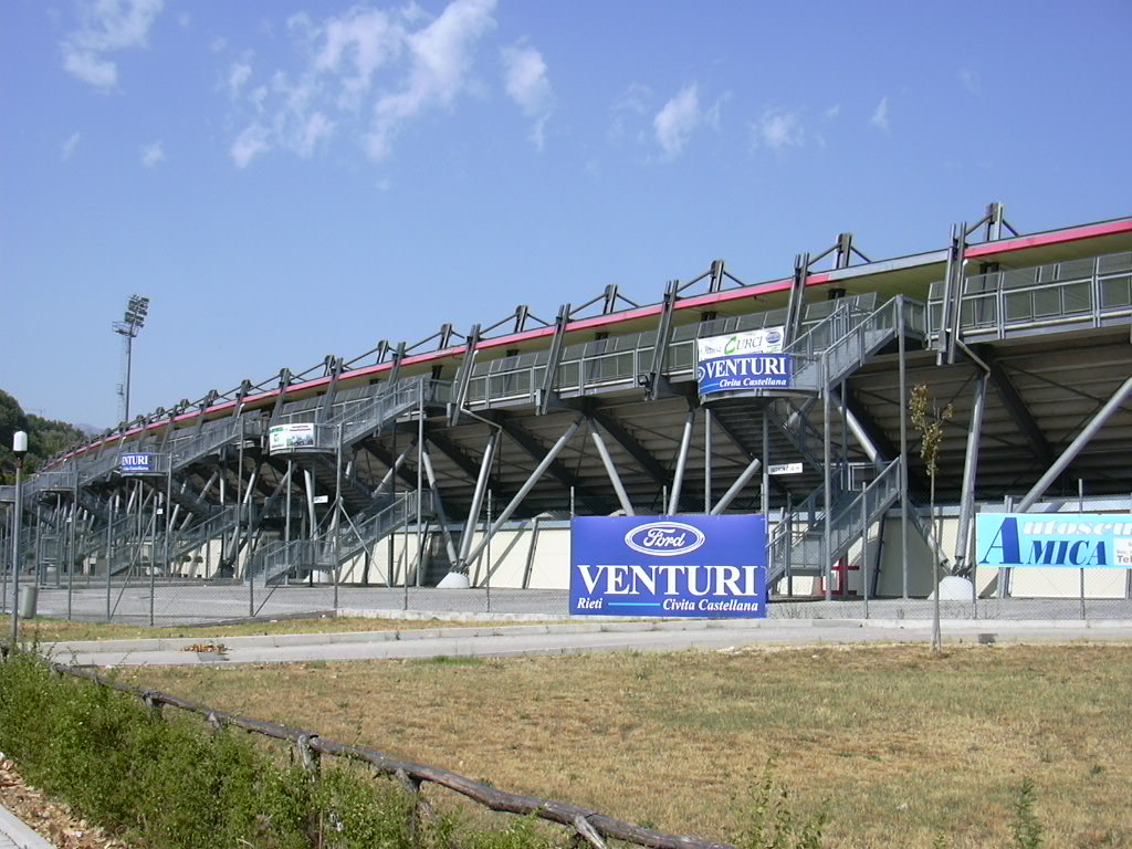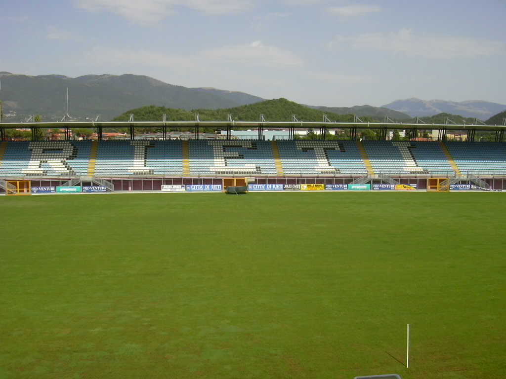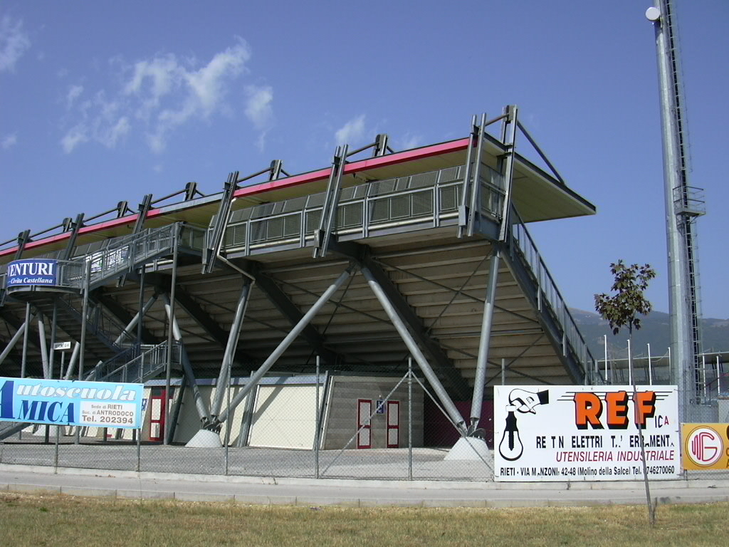 Prima del 1997 l'impianto era costituito unicamente da una tribuna, l'attuale "Valle Santa", e proprio sul finire degli anni novanta il comune di Rieti, proprietario della struttura, decise di procedere ad un ampliamento per dotare la città di un impianto più capiente. Vennero così realizzati gli altri settori e installato l'impianto di illuminazione. Nel 2010 per adeguarlo alle nuove norme di sicurezza in materia di impianti sportivi per il calcio, sono stati installati anche i tornelli.