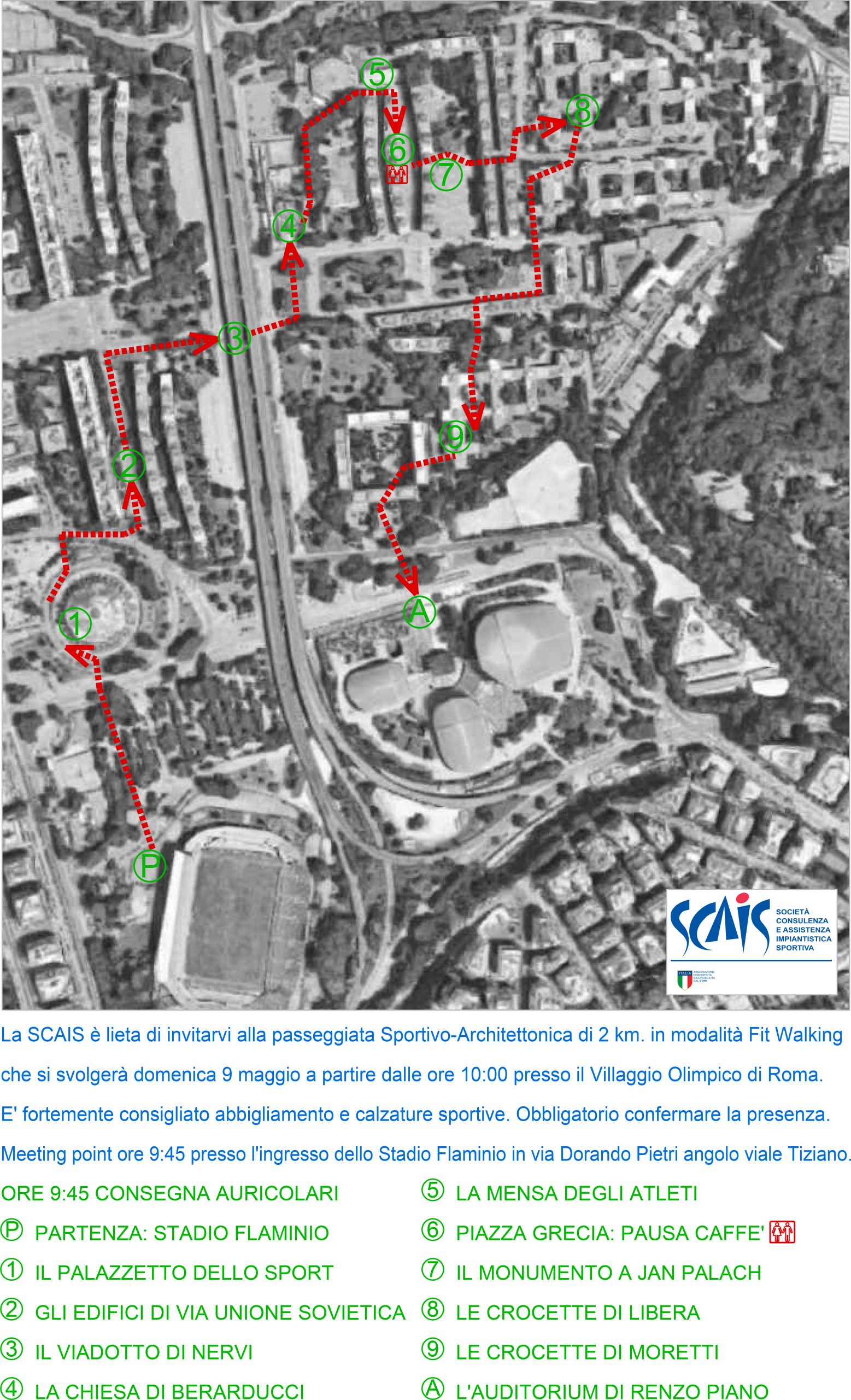 Nell’ambito del progetto #360inclusione, domenica 9 maggio alle ore 10.00 la Scais sarà lieta di accompagnare un gruppo di appassionati di arte e architettura ( in particolare over 65) in una passeggiata sportivo-architettonica di 2 km , in modalità fit – walking, alla scoperta del Villaggio Olimpico.