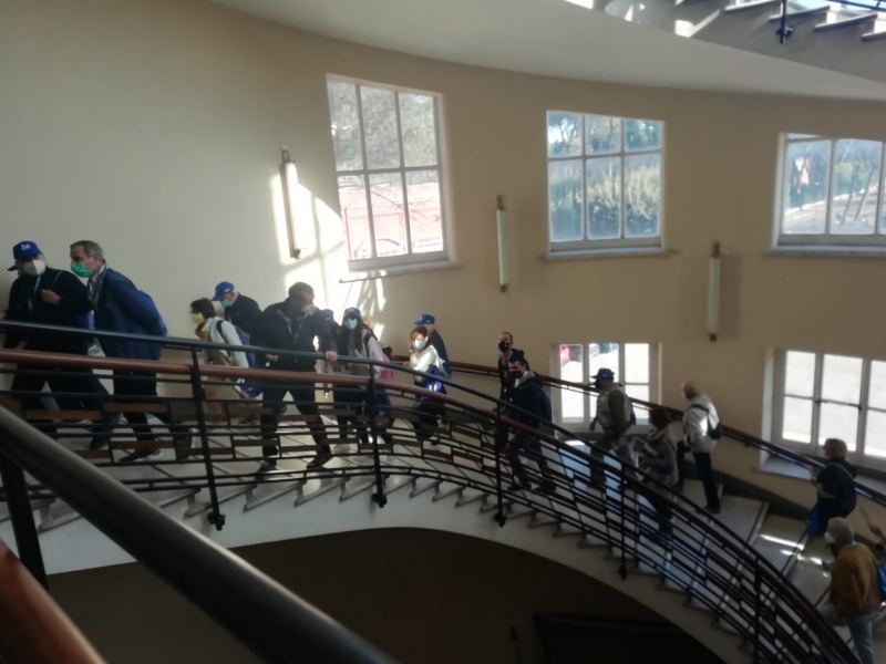 La visita è cominciata entrando nel Palazzo H, attuale sede del CONI e di Sport e Salute SpA, edificio progettato dall’Architetto Enrico Del Debbio nel 1927 e inaugurato nel 1932 come sede dell’Accademia di Educazione Fisica, prima opera del Foro Italico (all’epoca Foro Mussolini). L’Architetto Del Debbio elaborò un piano regolatore di tutta l’area del complesso, comprendente appunto il Palazzo H, lo Stadio dei Marmi, il Monolite e lo Stadio dei cipressi (l’attuale Stadio Olimpico).