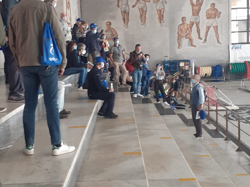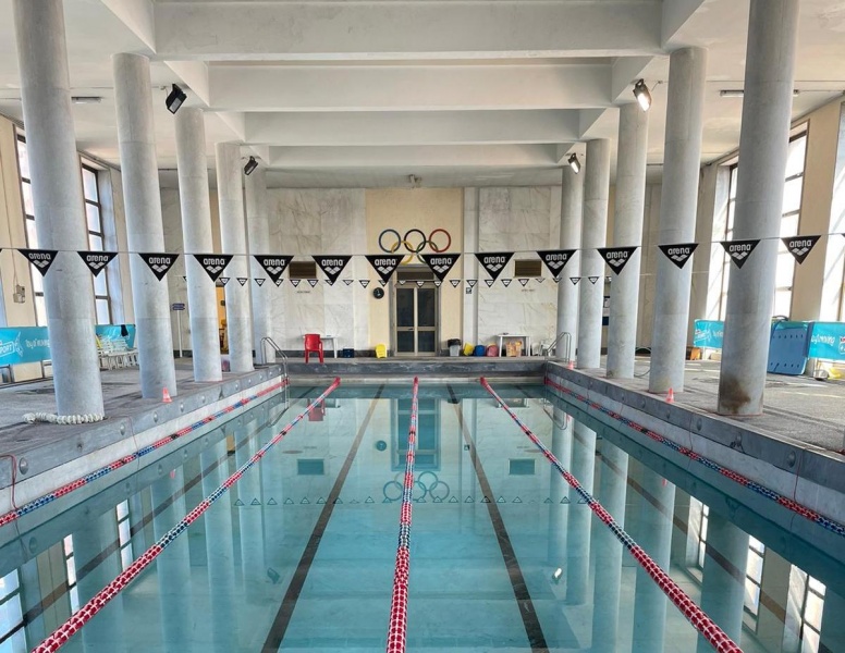 All’interno dell’edificio il gruppo ha potuto ammirare la grande vasca al primo livello lunga 50 m, interamente rivestita in marmo di Carrara e circondata da mosaici colorati di Giulio Rosso e Angelo Canevari. Al secondo livello è stata fatta una sosta presso la Sala Rossa nota anche come “Palestra del Duce”, capolavoro dell’architettura moderna di Luigi Moretti, ricca di marmi e statue di bronzo e caratterizzata da una splendida scala elicoidale. Da qui, divisi in piccoli gruppi, i partecipanti hanno potuto visitare la piscina pensile, sospesa a 20 m da terra: l’ambiente è decorato con mosaici e ampie vetrate ed è dotato di un tetto apribile che purtroppo ha perso la sua funzionalità. Scesi al piano interrato dell’edificio, attraverso la galleria sotterranea di collegamento, si è giunti nell’invaso delle piscine scoperte, che possono ospitare fino a 7000 spettatori.