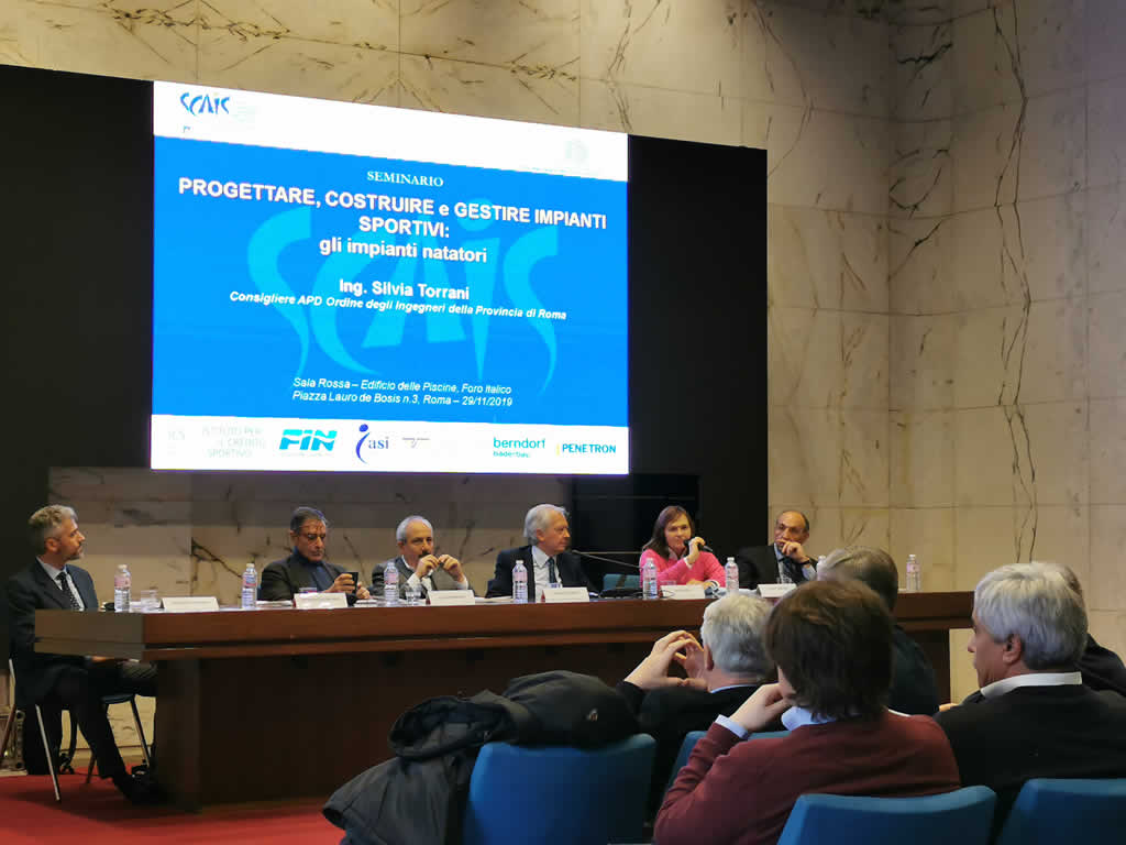 In questa occasione di formazione SCAIS ha chiesto la collaborazione di tecnici del settore strutturale, impiantistico, progettuale e del settore dell’efficientamento energetico di grandi strutture, con esperienza nell’impiantistica sportiva e di impianti natatori. Hanno preso parte all’introduzione del Seminario Silvia Torrani, Consigliere della APD dell’Ordine degli Ingegneri di Roma e in rappresentanza dell’Ordine degli Ingegneri, Claudio Barbaro, Presidente di ASI Associazioni Sportive e Sociali Italiane, e Antonello Panza, Segretario Generale della Federazione Italiana Nuoto.