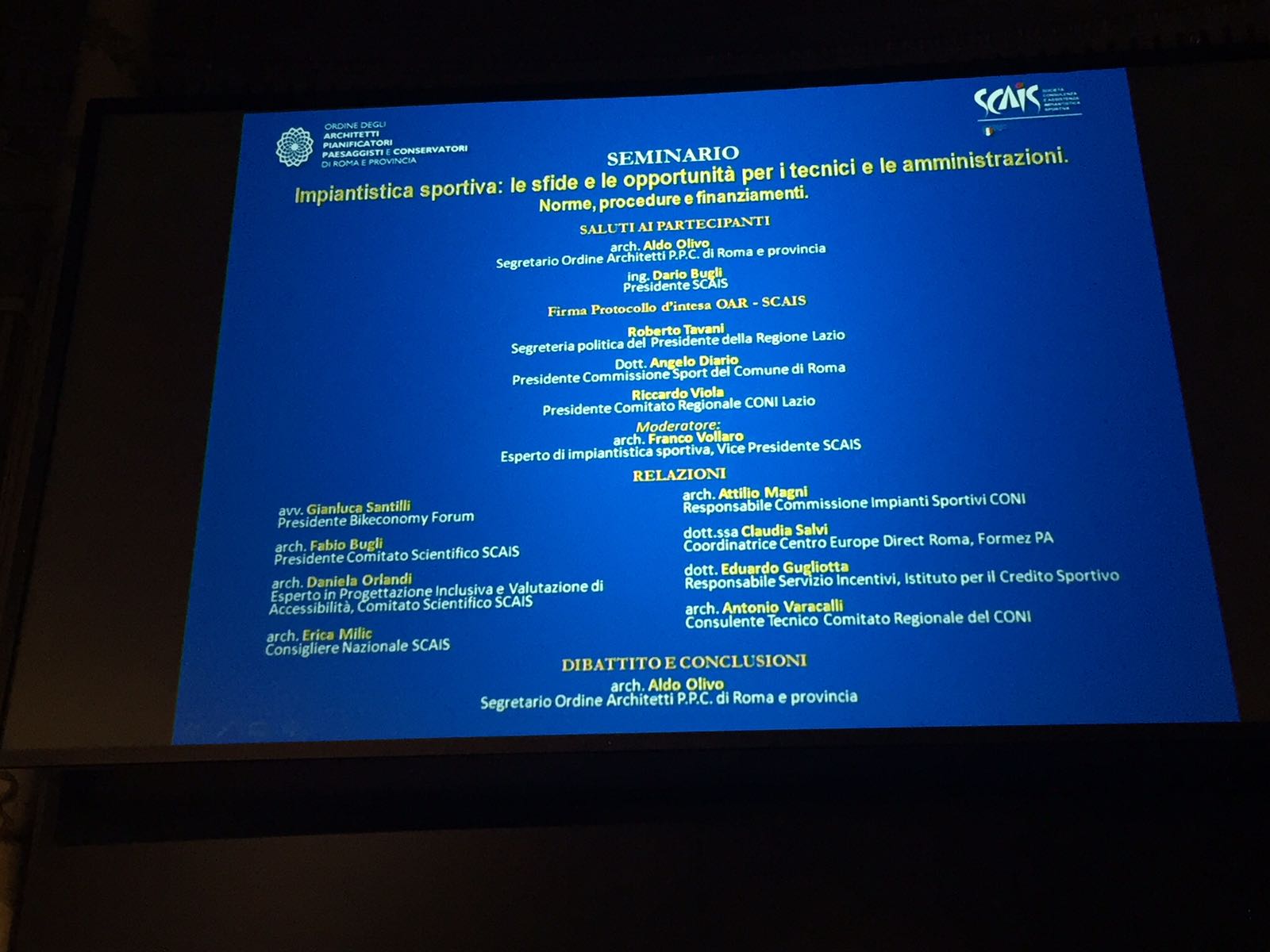 Ha aperto i lavori l’Arch. Aldo Olivo, segretario dell’Ordine degli Architetti, a cui sono seguiti gli interventi dell’Ingegnere Dario Bugli Presidente SCAIS, di Roberto Tavani, Segreteria politica del presidente della Regione Lazio, del Dott. Angelo Diario, Presidente Commissione Sport del Comune di Roma, del Presidente Comitato Regionale CONI Lazio Riccardo Viola. Gli interventi sono stati moderati dall’Arch. Franco Vollaro, Esperto di impiantistica sportiva e Vice Presidente SCAIS.